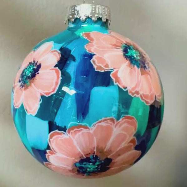 Aloha-inspired floral ornament with background mix of blues and foreground covered in peach/white flowers.