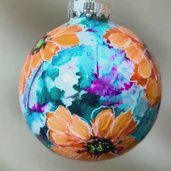 Hand-painted paper that was torn and glued to the ornament, then the paper was painted with orange/peach flowers.