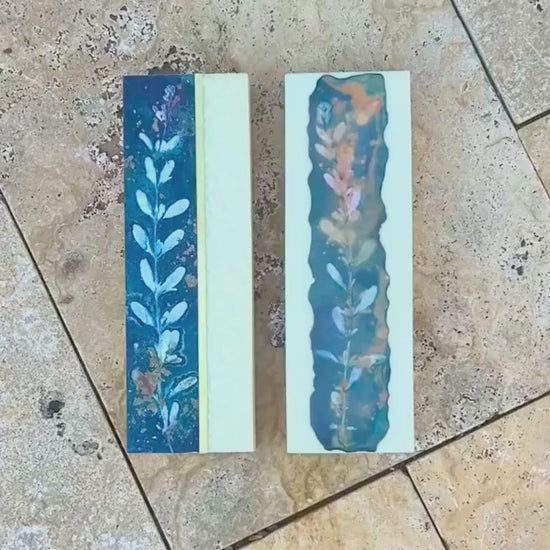 This two-piece mixed media artwork is created with cyanotype, encaustic wax, and brass on gallery-wrapped birch wood panels. Botanical forms emerge in deep blue tones, captured through the cyanotype process and layered with translucent encaustic that adds depth, texture, and subtle variation across the surfaces.