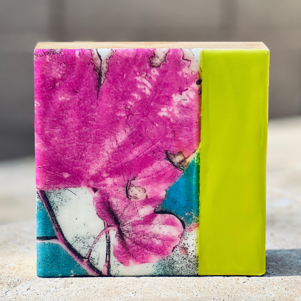 Colorful cyanotype print embedded into encaustic wax then accented with chartreus green. wax.