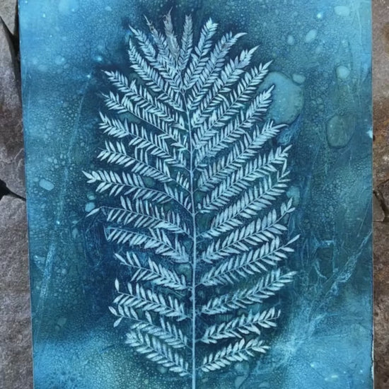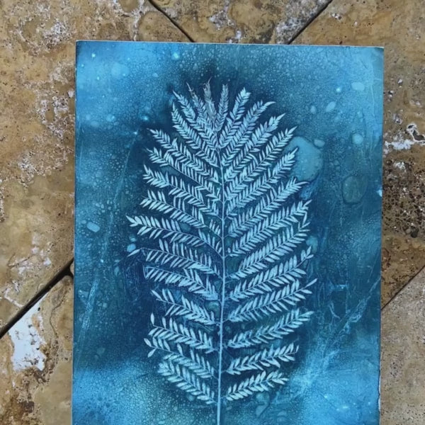 This luminous print has incredible detail, both within the leaves and the background. This detail was captured by using a wet cyanotype technique where reactive materials were added before exposure to the sunshine. If you look closely at the background texture, you'll see the effects experimenting with soap bubbles, ground salt, plastic wrap and subtle toning from baking soda applied before the print was pressed under glass and exposed to sunlight.