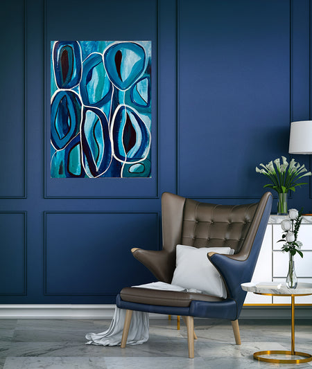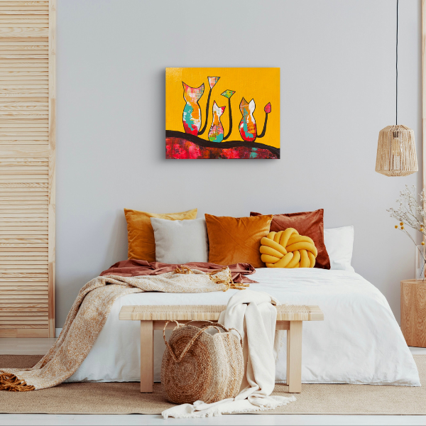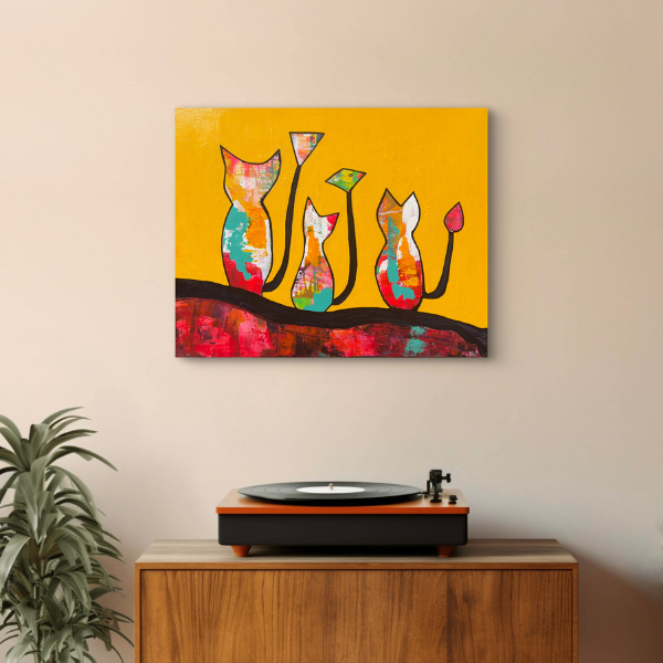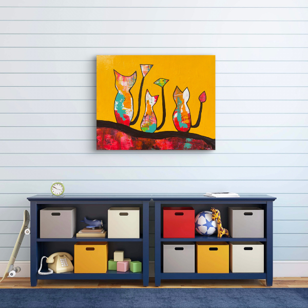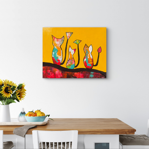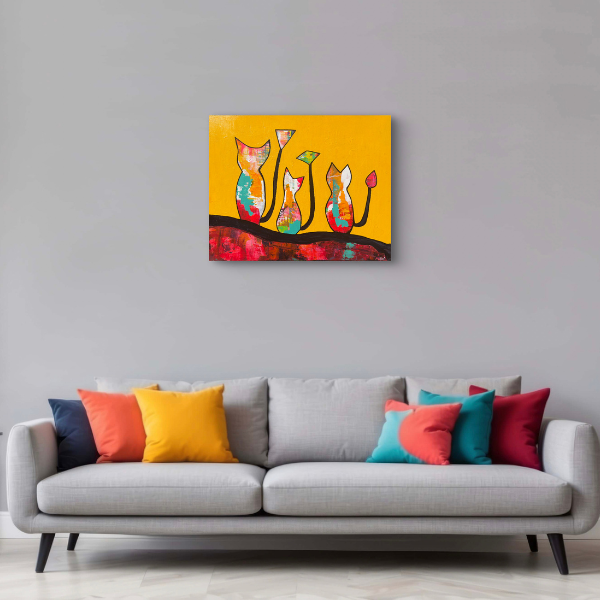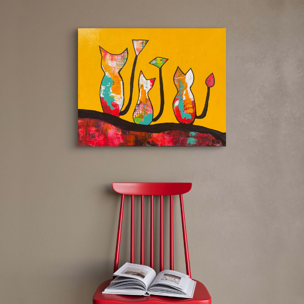 Add a bit of color and whimsy to your home with this 24x30 acrylic painting on gallery wrapped canvas. This is a representational body of work depicting three stylized cats with colorful, abstract patterns on their bodies sitting on a red wall against a vibrant yellow background. The piece combines elements of abstraction and playfulness, with a bold use of color and form.