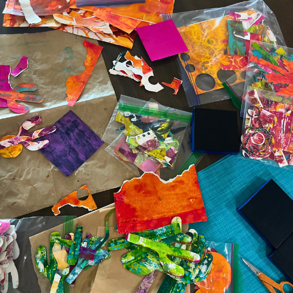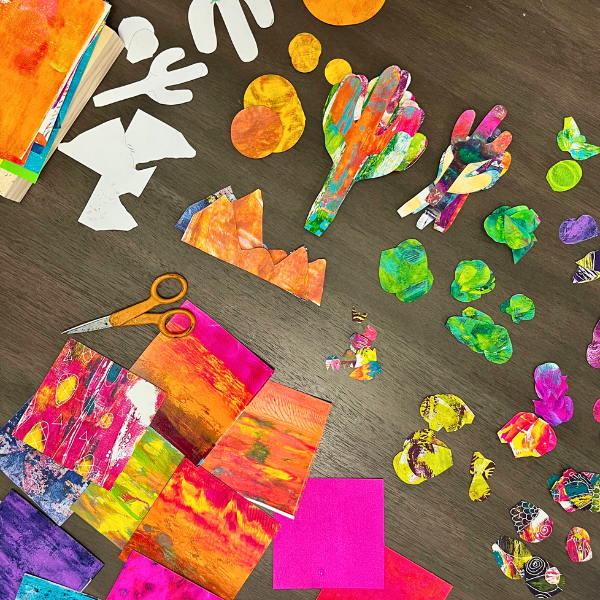 Each piece is created from cut and torn hand-painted papers, thoughtfully arranged and adhered to a painted birch wood panel. Finished with a high-gloss varnish, they shine with a modern, vibrant energy.