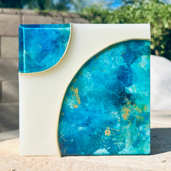 Tide Pool 1 is a 6x6 mixed media piece created using hand-painted paper, cut & shaped brass and resin.